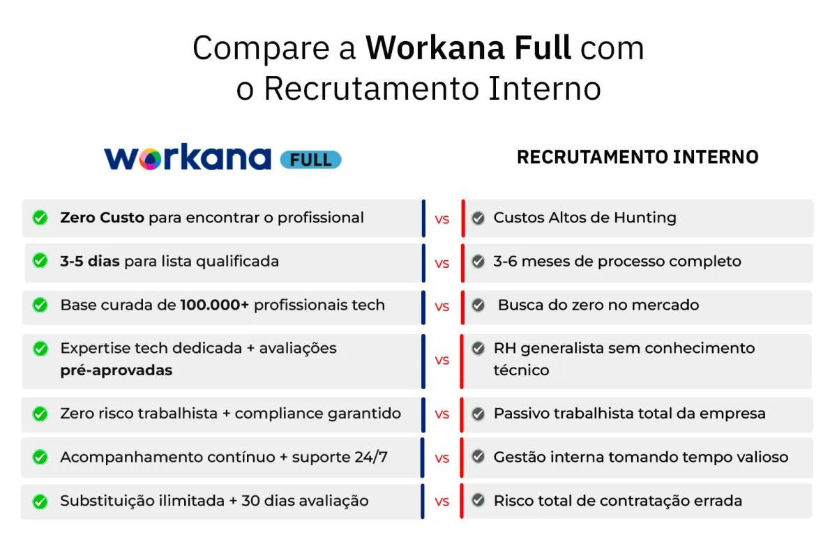 Workana Full oferece profissionais dedicados full-time com acompanhamento contínuo e zero risco trabalhista, enquanto freelancers são responsáveis por projetos pontuais de curta duração.